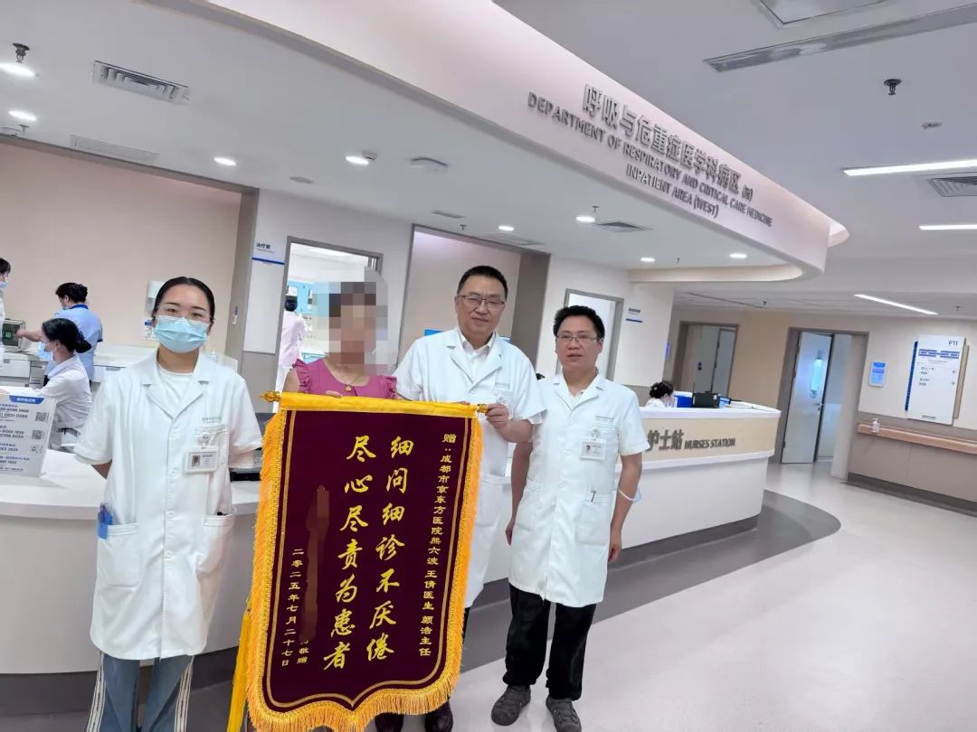 与此同时,科室主任颜浩、医生王倩共同参与病例讨论,多学科协作优化治疗方案。经过精心救治,黄婆婆的病情逐步稳定。7月30日,其女儿将锦旗送到三位医生手中:“是他们的坚持,让我们看到了希望。”