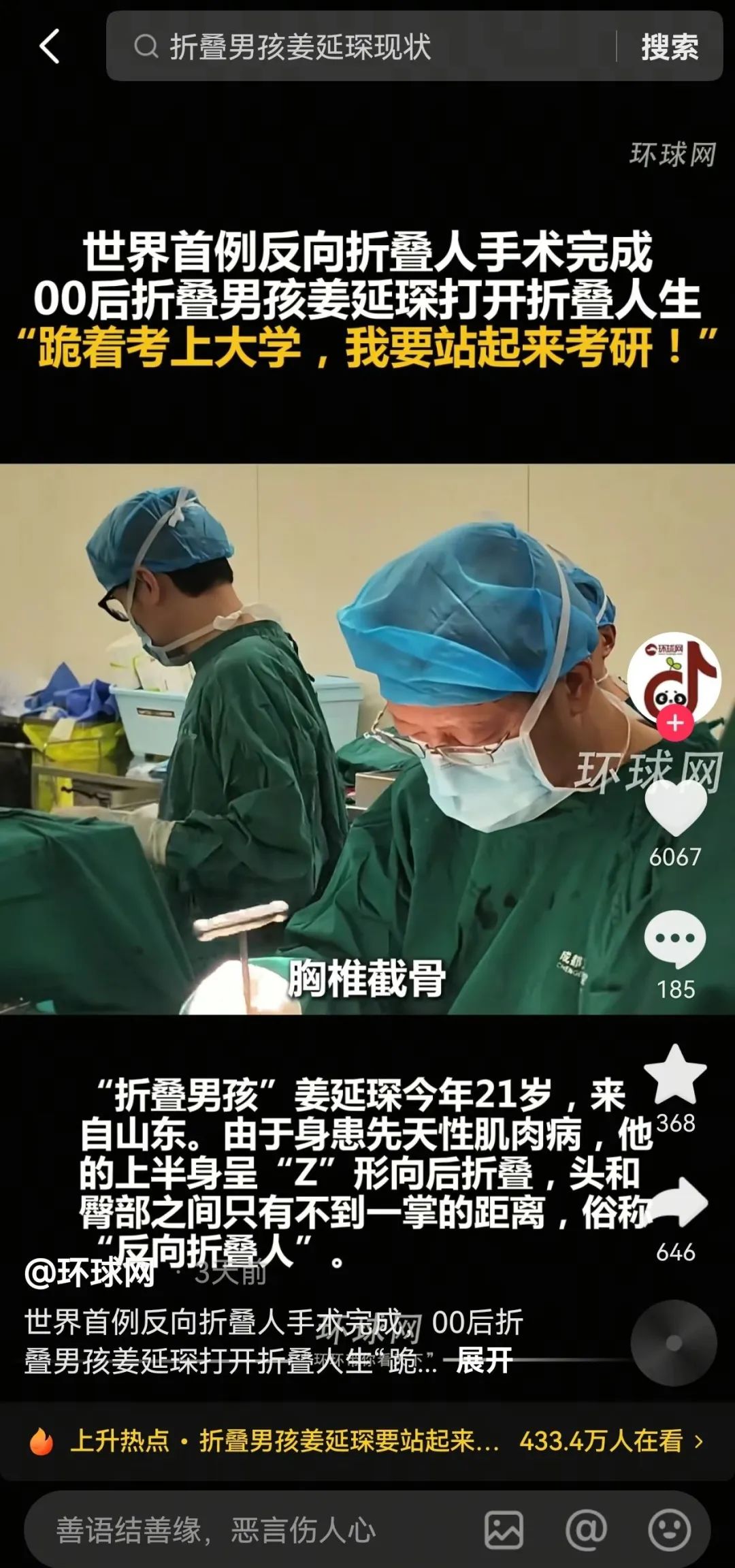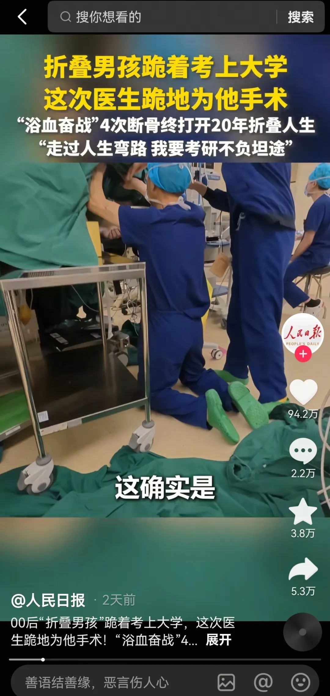 此次手术引发巨大关注,人民日报、新华社、环球网等央媒以及十多家省市主流媒体纷纷报道全网播放量数亿,截至目前,该视频在《人民日报》抖音号,播放量近5000万点赞量94万,在《黄金30分》抖音号播放量高达1.8亿,点赞量287万,在《四川观察》抖音号播放量超2700万,点赞量35万。